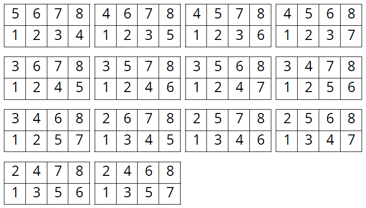 在4×2的方格(如上圖)中填入1…8的數字,並且滿足以下遞增條件: