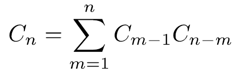 那麼,滿足這二個額外條件的填入數字的方法共有Cm-1Cn-m種。因為每一個填入數字的方法都有一個唯一的m滿足以上額外條件,我們就推得遞迴式
