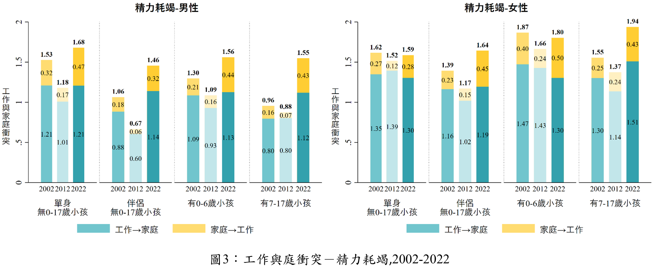 其次,臺灣青壯年感受到精力耗竭的程度高於時間擠壓6 (圖3)。整體而言,雖有少數例外,精力耗竭的程度隨著時間在增加,女性的感受度平均而言比男性高,但男性成長的幅度比女性大。除此之外,女性精力耗竭的程度跟家庭階段的連結性比男性高,在進入婚姻與有小孩後,女性感受精力耗竭的程度明顯增加,而男性則是在單身無未成年孩子的階段,對於精力耗竭有較強烈的感受,不過,有未成年小孩的男性感受到精力耗竭的程度也非常明顯,也顯示了男性在這個階段所承受的負擔。