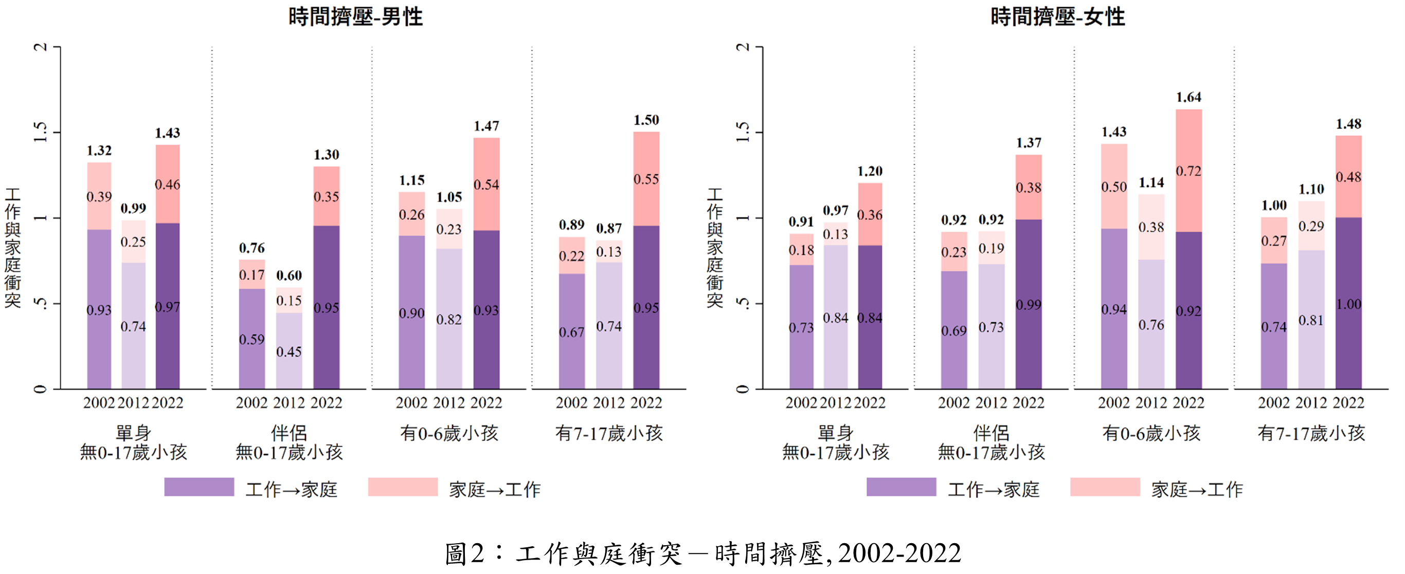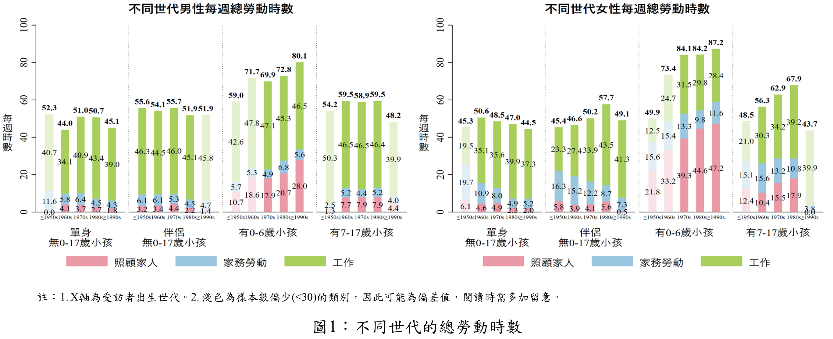女性的總勞動時數與生命階段緊密扣連。單身無未成年小孩的女性,工作時數的增加伴隨著家庭內部勞動時數的減少,讓總勞動時數的世代差異不明顯;有伴侶但無未成年子女的女性,總勞動時數在成長,主要原因是工作時數的增加,顯示女性在結婚之後繼續留在勞動市場的比例提高;有0-6歲小孩的女性,在最近幾個世代工時呈現些微下降,但照顧時間卻大幅增加,成為總勞動時數增加的主因;有7-17歲小孩的女性,總勞動時數低於有0-6歲小孩的女性,位居第二,他們在工作與照顧時數的增加,成為跨世代總勞動時數成長的主因。