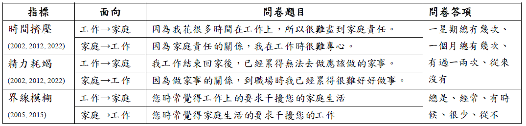 3參考Shih-Yi Chao, accepted, “Work and Family Conflict: Indicators, Changes, and Welfare Policy Regimes”, Taiwan Social Change Survey Symposium Series Ⅳ: Family and Marriage [in Mandarin]. Editor(s): Chyi-In Wu, Yang-Chih Fu, and Yeu-Sheng Hsieh. Institute of Sociology, Academia Sinica.
