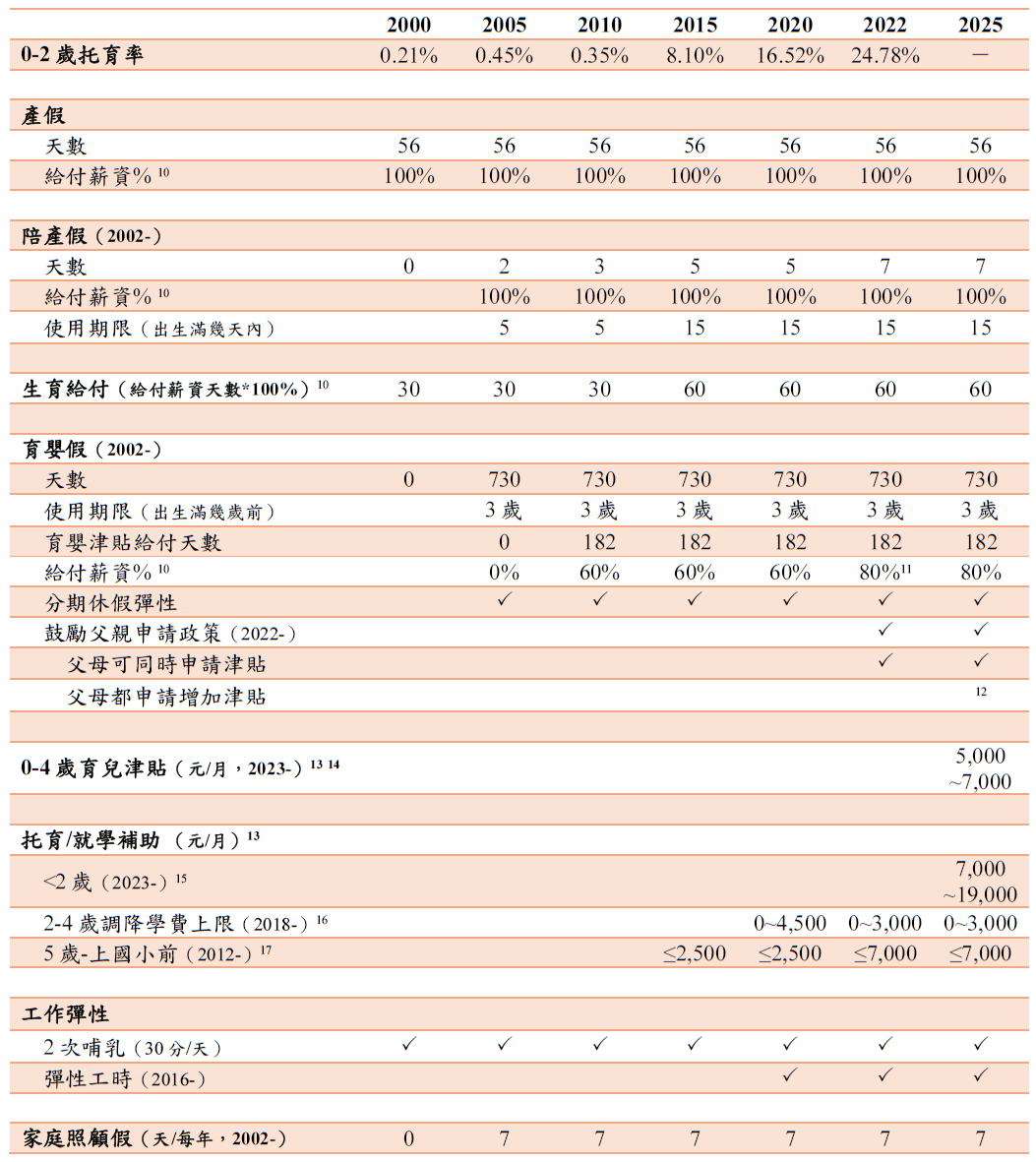 14中央從2012年開始,對弱勢家庭、低與中低收入戶、綜合所得稅率小於20%家戶有2歲以下幼兒的家庭提供育兒津貼,2019年擴及至有2-4歲幼兒的家庭。2023年取消排富條款改為普發。2023年以前的補助細節請見https://www.edu.tw/News_Content.aspx?n=D33B55D537402BAA&s=1F066099DDDA393B 。而在中央尚未制定相關補助政策前,部分地方政府有發放育兒津貼。中央的育兒津貼政策施行後,少數縣市政府仍持續提供相關補助,但兩者只能擇一申請。