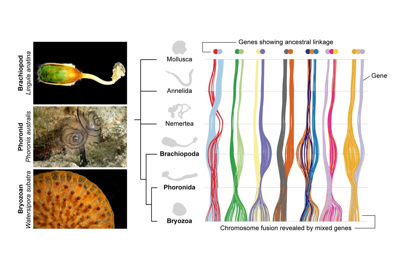 A team led by Assistant Research Fellow Yi-Jyun Luo at the Biodiversity Research Center, in collaboration with researchers in Japan and the United Kingdom, has now generated the first chromosome-level genome of a phoronid and compared it with those of bryozoans and brachiopods. The study uncovered seven irreversible chromosome fusion events shared between phoronids and bryozoans, one of which is also shared with brachiopods. These fusions are absent in other lophotrochozoans such as molluscs, annelids, and nemerteans, providing sequence-independent evidence for the monophyly of lophophorates and demonstrating that these three phyla indeed share a recent common ancestor.