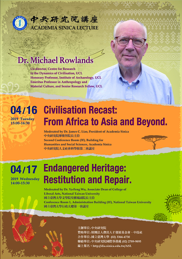 Professor Michael Rowlands, an internationally renowned archaeologist and anthropologist, will visit Taiwan as Academia Sinica Lecturer and deliver two lectures during his stay. The first lecture, entitled “Civilisation Recast: From Africa to Asia and Beyond.” will be given at Academia Sinica on April 16. His second lecture, entitled “Endangered Heritage: Restitution and Repair.” will be delivered at the National Taiwan University on the following day. Members of the media and the public are welcome to attend.