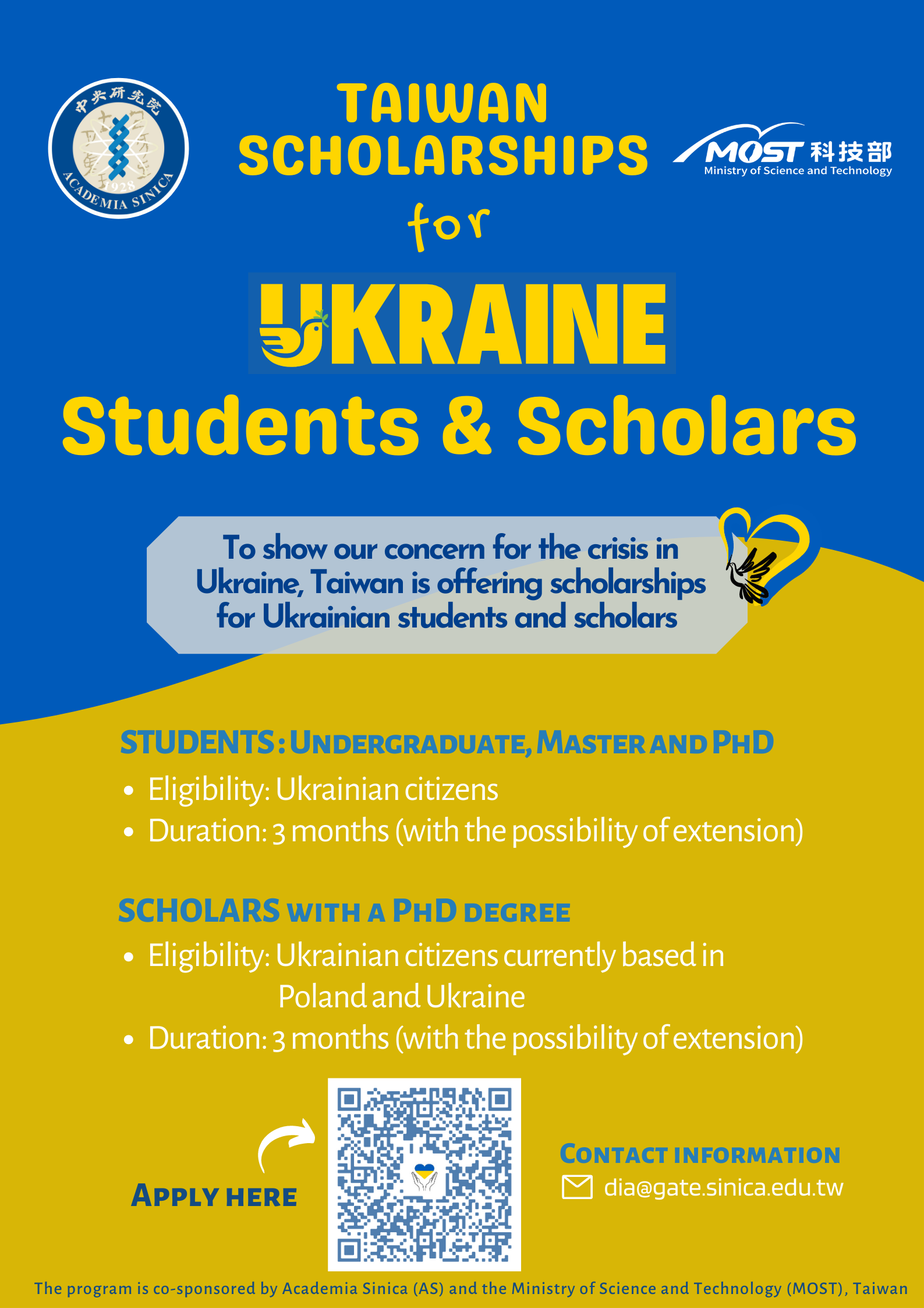 To show our concern for the crisis in Ukraine, Taiwan is offering scholarships for Ukrainian scholars and students. The application is open until further notice.