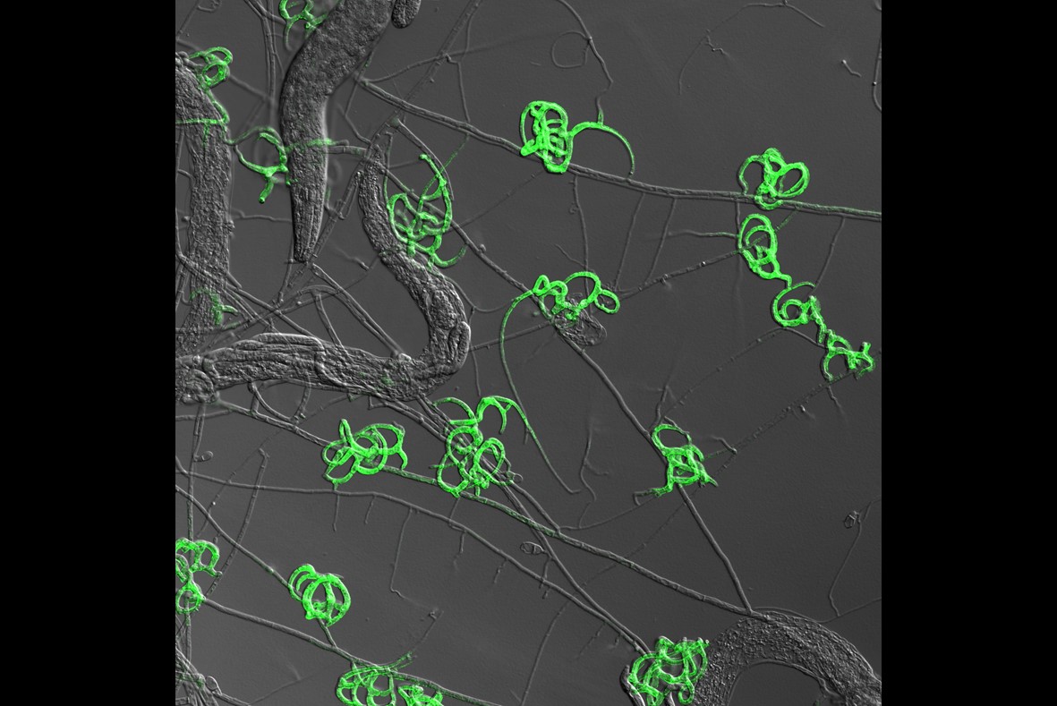 線蟲廣泛存在於土壤中,是地球上數量最多的動物,而有些真菌在養份缺乏的環境之下演化出捕食線蟲的能力。為了深入了解線蟲捕捉菌捕食線蟲的分子機制及關鍵的過程,本院分子生物研究所薛雁冰副研究員及研究團隊,利用轉錄體分析技術,及一系列的實驗證明,發現線蟲捕捉菌在不同捕食階段的關鍵基因與過程。線蟲捕捉菌偵測到線蟲訊號時,在初期會提高DNA複製和核醣體生成,在中期發育捕捉構造階段時,大量外泌蛋白,包含一些只在捕捉構造表現的特有蛋白,在晚期則依賴許多蛋白酶來消化線蟲。此研究讓人們對真菌捕食線蟲的機制有進一步的了解,為未來食蟲真菌的分子機制及演化研究奠定了重要的基礎。此研究成果已於本(112)年11月發表在期刊《公共科學圖書館:生物學》(PLOS Biology)。