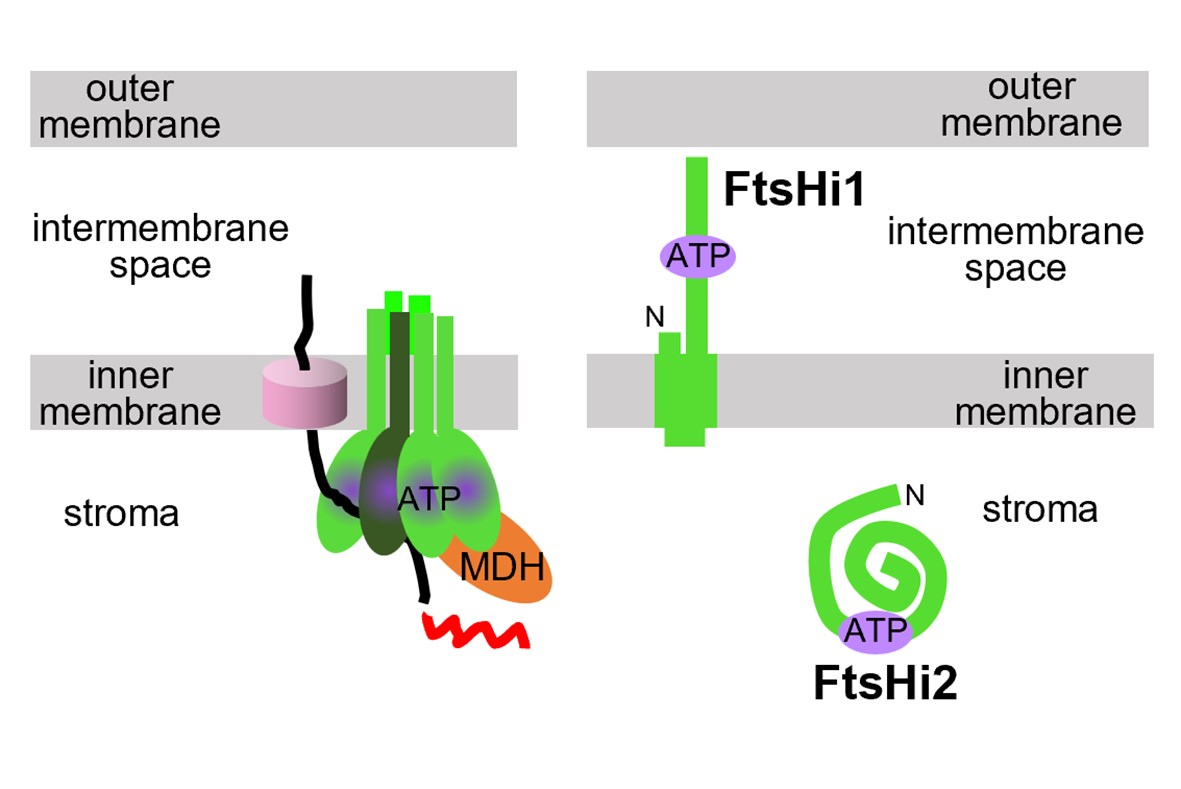 葉綠體是光合作用及其他生合成反應作用發生的重要胞器,了解作用於葉綠體的蛋白質如何運輸進葉綠體,是至關重要的論題。先前研究認為葉綠體內膜蛋白複合物具有伸入基質的異六聚體 ATP 酶結構,可提供蛋白質轉運進入基質的能量。本院分子生物研究所特聘研究員李秀敏團隊利用生化實驗發現,此內膜蛋白複合物的兩個蛋白質FtsHi1及FtsHi2位於內膜的兩側:FtsHi1的ATPase domain位於膜間隙(intermembrane space)而非基質;而FtsHi2則非膜蛋白。此研究成果提供葉綠體轉運動力因子的結構及機制進一步的發現,並已於本(112)年9月發表在《美國國家科學院院刊》期刊(Proceedings of the National Academy of Sciences of the United States of America, PNAS) 。