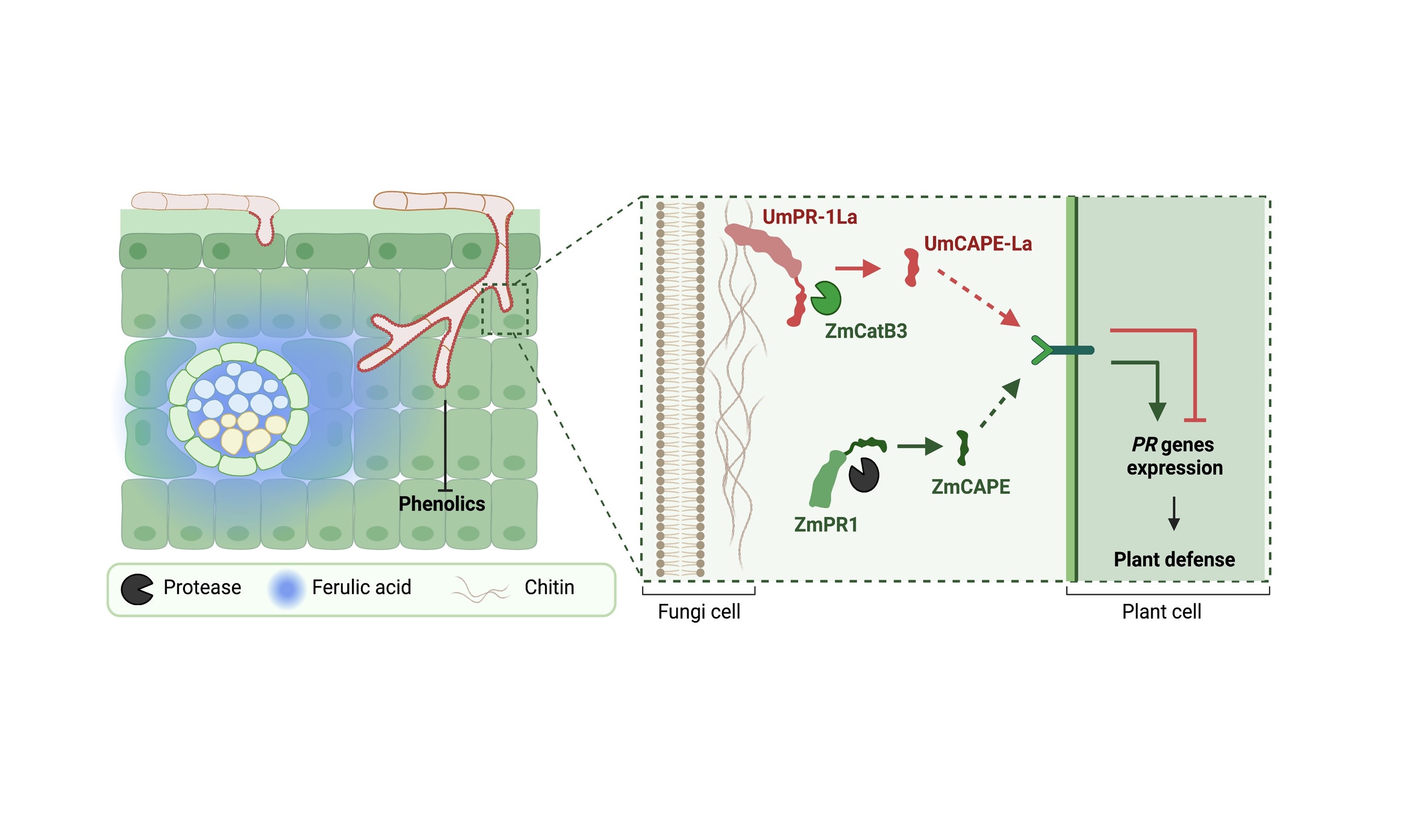 作物與病原菌之間有永不停歇的攻防戰,植物在不斷強化對病原菌的免疫力的同時,病原菌也一直設法突破植物的抵禦防線。這個攻防戰中包含一群同時出現在真菌與宿主中的同源PR-1蛋白質,這群蛋白質在植物的功能是增加防禦力,但在真菌中卻可增加對宿主的感染力。本院植物暨微生物學研究所馬麗珊助研究員、許全智博士和生物多樣性中心江殷儒研究員團隊合作發現:玉米黑粉菌內類似宿主PR-1的蛋白質(PR-1-like; PR-1L)可以感知植物釋放出的有毒酚類化合物,進而包覆菌絲以抵抗酚類化合物。真菌也同時利用宿主蛋白酶CatB3將PR-1L分解並釋放出類似源自植物宿主PR-1防禦蛋白的小型胜肽,藉由混淆宿主的免疫受體,來抑制植物免疫力,讓玉米黑粉菌可以順利在宿主中生存。這個研究首度揭示真菌寄生及與宿主之間藉由同源蛋白質的共同演化所產生的巧妙攻防策略,相關成果也可運用在強化作物對真菌病原體的抵禦力。此研究成果已於本(112)年9月刊登於《自然通訊》(Nature Communications)。