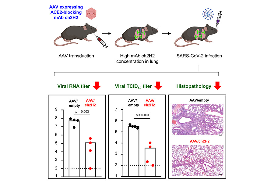 在面對新冠肺炎後疫情時代,開發持久且廣效型的抗病毒藥物為當務之急,以預防變種新冠病毒和其他未來新興冠狀病毒的大流行。本院生物醫學科學研究所陶秘華研究員與王宜萱博士團隊合作,成功找到一株能與hACE2上的病毒棘蛋白結合位點具有高結合力的單株抗體,命名為ch2H2。這個單株抗體不影響hACE2的正常功能,能有效阻斷多種新冠病毒變異株對細胞的感染,利用腺相關病毒載體(AAV)一次性注射,即可在小鼠體內產生持久且高濃度的ch2H2抗體,抵抗Omicron BA.5變異株的感染,顯著降低受感染小鼠肺中的病毒量,並減少肺部的病理變化。結果證明透過AAV遞送的hACE2阻斷抗體,可預防以hACE2為受體的所有變異株新冠病毒,具有開發為廣效抗冠狀病毒藥物的潛力。