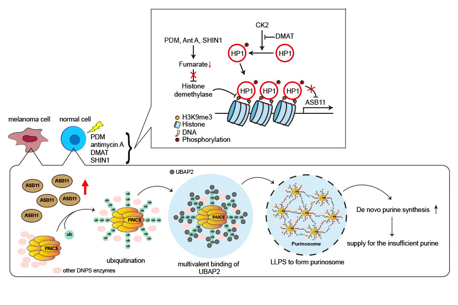 在細胞對嘌呤需求增加的壓力條件下,嘌呤從頭合成(DNPS)途徑中,所有酵素會聚集形成嘌呤體。儘管嘌呤體已被發現15年,但其組裝機制仍屬未知,這也阻礙了對嘌呤體生理病理功能的具體剖析。本院生物化學研究所陳瑞華特聘研究員團隊首度發現嘌呤體組裝機制,並闡明了癌細胞仰賴嘌呤體生成得以增殖和存活的模式。目前癌症代謝研究主要聚焦於代謝途徑的重編,發現嘌呤體形成在癌症進展中的關鍵作用為研究癌症代謝開闢了新方向。這項研究揭示了代謝酶區室化對人類惡性腫瘤的影響,並強調了嘌呤體靶向作為抗癌策略的潛力,已於本(112)年10月發表在《分子細胞》(Molecular Cell)。
