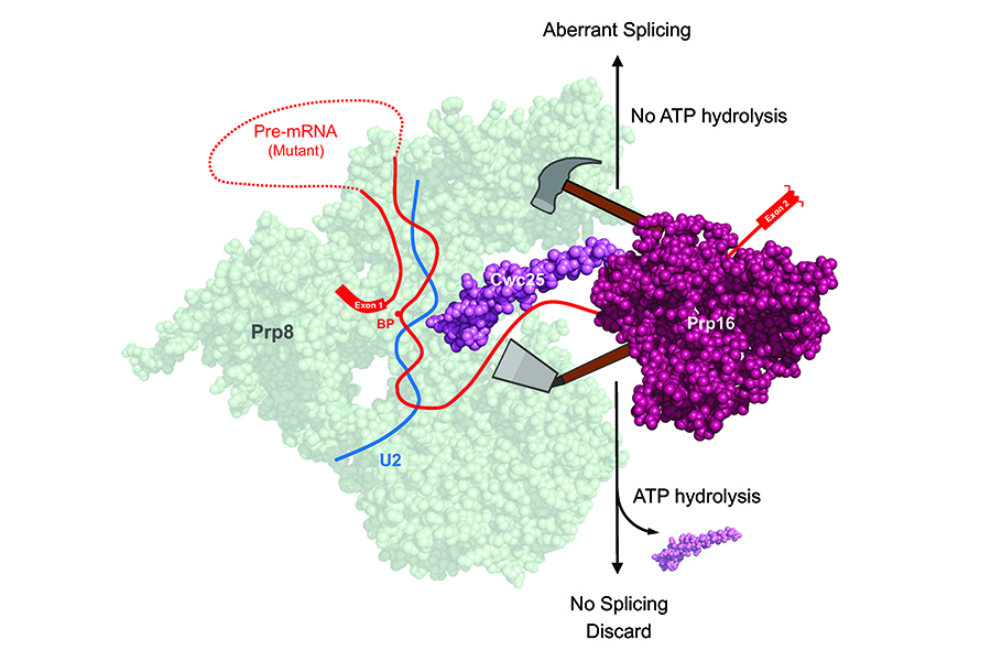 絕大多數的真核生物基因內含許多序列阻斷基因的連續性最終卻沒有被轉譯成蛋白。這些序列必須在一個叫做核醣核酸剪接反應的過程中被移除,而執行此剪接反應的是一個巨大的核醣蛋白複合體,稱為剪接體。核醣核酸解旋酶Prp16是剪接反應的一個重要參與因子。在第一步的剪接催化反應後,Prp16會藉由水解ATP將參與第一步反應的核心因子Cwc25和Yju2從反應中心移除,讓3’剪接位得以進入反應中心以進行第二步反應。Prp16另一個公認的角色是可檢視剪接位的序列,確保剪接反應的準確度,而這個功能也需要ATP。本院分子生物研究所鄭淑珍特聘研究員團隊發現,當剪接位有鹼基突變導致剪接反應變慢時,Prp16可藉由將Cwc25穩定在剪接體上來促進第一步反應,但卻會造成錯誤的剪接位選擇。這個研究結果顛覆了過去對於Prp16在剪接反應中扮演校正功能的認知,卻也確認Prp16對於具正常的或突變的剪接位的前訊息核醣核酸,在剪接反應中都扮演推動反應向前的角色。這個發現改變了大家對Prp16的角色以及剪接校正的觀點,論文被NAR期刊選為重大突破研究。