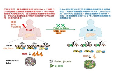 糖尿病無法被治癒,主因常為患者胰島細胞的衰竭。本院農業生物科技研究中心楊文欽研究員團隊發現胰島細胞特有的糖尿病標靶「蛋白雙硫異構酶(Pdia4)」,可調控胰島細胞衰竭。其抑制劑(PS1)能透過遏止胰島細胞衰竭,達到逆轉糖尿病之功效,目前正規畫相關臨床試驗。此研究成果已於今(2021)年9月刊登於《EMBO分子醫學期刊》(EMBO Molecular Medicine)