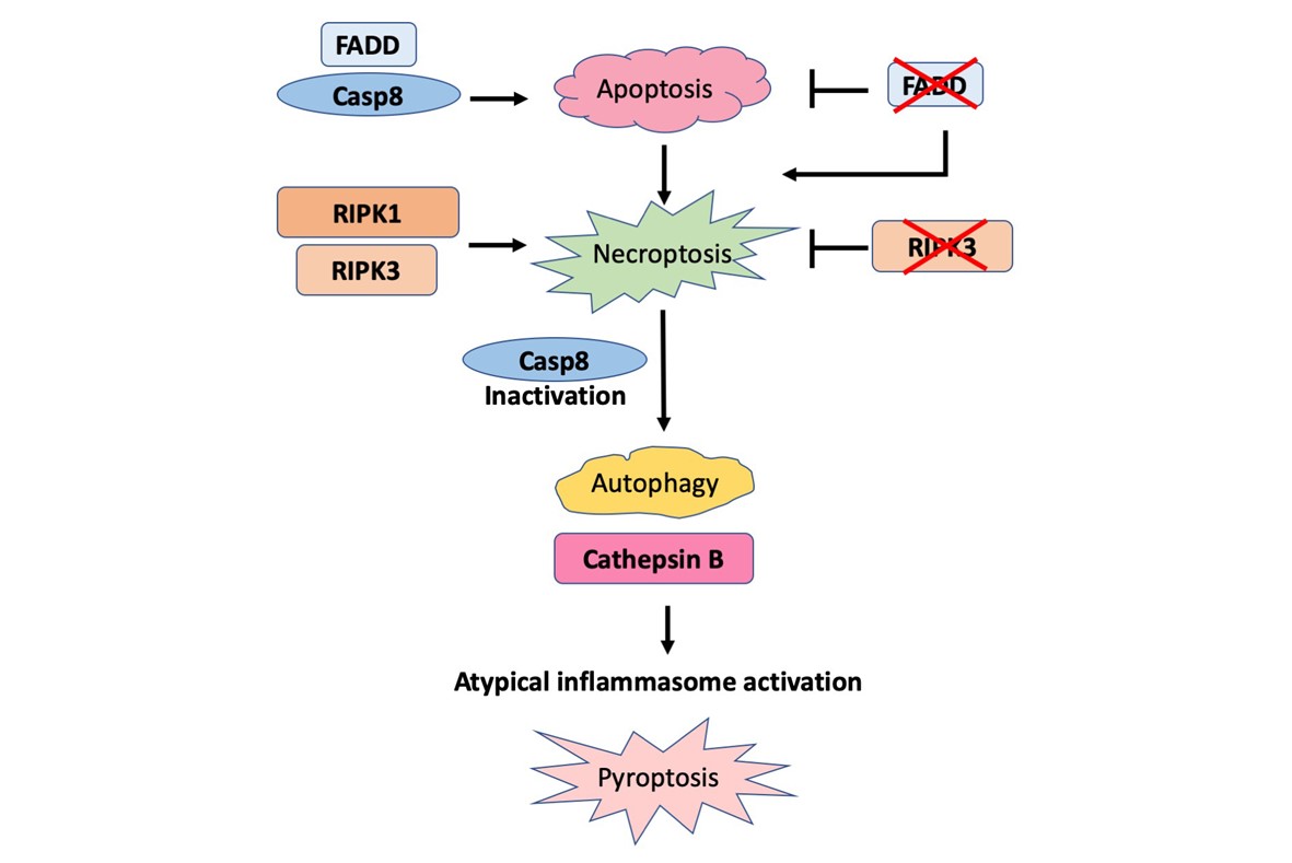 細胞可以不同死亡程式轉換抑制胞內病原體增殖,本院分子生物研究所兼任研究員賴明宗團隊與基因體中心特聘研究員謝世良合作,發現序列性細胞死亡的關鍵轉換機制。本研究於細胞凋亡及程序性壞死被阻斷的骨髓性細胞中,藉由抑制caspase-8活性可誘發細胞焦亡,而這是經由引導細胞自噬和活化cathepsin-B,及刺激非典型發炎小體形成。成果已於今(2022)年11月發表在《科學進展》(Science Advances)。