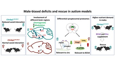 本院分子生物研究所特聘研究員薛一蘋團隊運用自閉症模式小鼠,揭露自閉症好發於男性的可能機制。本研究首次發現,公母性別差異會影響自閉症致病基因突變對於神經迴路及社交行為之作用,進一步證實營養補充品,如支鏈胺基酸和鋅,可有效緩解小鼠社交行為之障礙。成果已於今(2022)年11月發表於國際期刊《腦》(BRAIN)。