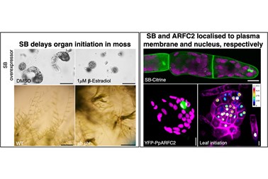 本院植微所鄭惠國助研究員攜手日本研究團隊發掘一種命名為「睡美人」(簡稱SB)的阿拉伯半乳聚糖蛋白質(arabinogalactan protein),其擁有讓植物沉睡的魔法。研究指出,缺乏SB的小立碗蘚突變株會加速配子囊柄的發育;此結果引導研究團隊探索SB與細胞壁的微妙關係。團隊發現SB透過與轉錄因子ARFC2溝通,調控果膠酯酶(pectin methylesterase)生成量,致使細胞壁變得堅實,從而揭開阿拉伯半乳聚糖蛋白質參與形塑細胞壁的重要角色。成果已發表於國際期刊《發育》(Development)。