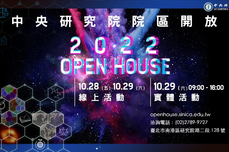 臺灣最盛大的科學嘉年華—中央研究院「院區開放」(Open House)」參觀活動,去年受疫情影響採線上舉行,今年實體回歸,將於本(111)年10月29日(六)登場!往年「一日限定」的節目內容也特別加場,線上活動於10月28日(五)至29日(六)加碼舉行,一連2天總計有演講座談、實驗室參觀、互動體驗等將近200場活動,虛實串聯,讓民眾不論現場參觀或在家都能盡情參與,開箱中研院的人文及科研寶藏。
