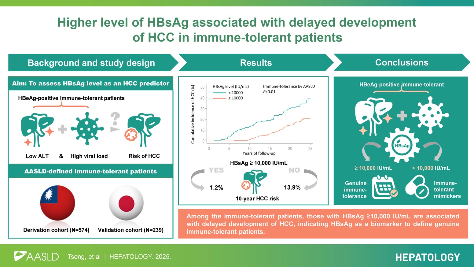 研究團隊發現,B型肝炎表面抗原濃度低於100 IU/mL 的非肝硬化、不活動性患者,其肝癌年發生率僅 0.08%,遠低於國際建議的0.2% 監測門檻,其肝癌風險與一般無慢性肝炎族群相當,顯示此類患者的病況已接近「治癒」標準,對精準醫療與優化肝癌篩檢策略具有重大臨床意義。另一項重要突破,則是首次證實B型肝炎表面抗原高於10,000 IU/mL者,反而出現肝癌延遲發展的現象,有助於界定真正低風險的免疫耐受族群,以避免過度治療。此成果經臺、日大型世代研究互相驗證,凸顯B型肝炎表面抗原在不同疾病階段的多元臨床價值。