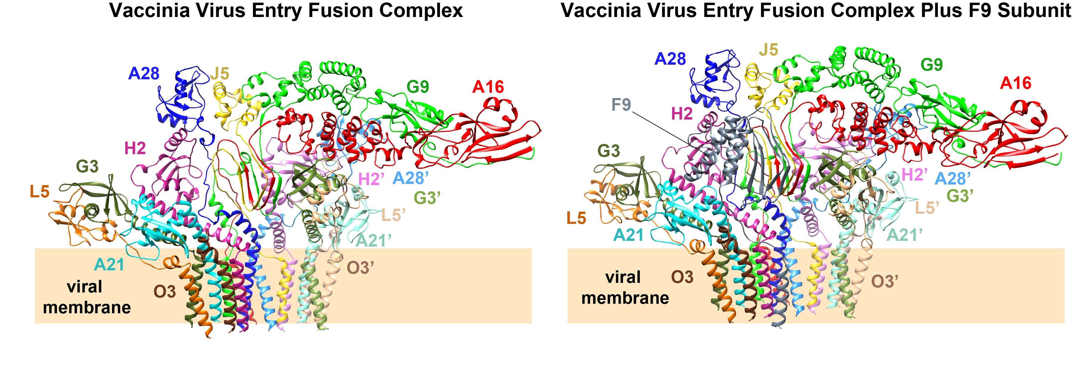 透過結構與演化分析發現,A16的N端具有一個保守結構域,其中包含肉豆蔻醯基(myristoyl)的結合口袋,以及富含苯丙胺酸的區域,是穩定核心三聚體與調控病毒與脂質結合的關鍵。此外,另一個融合蛋白質的成分F9,透過Delta基序與J5、A21和H2結合,大幅增強了EFC在融合前的結構穩定性。此研究定義了痘病毒EFC為獨特的多蛋白融合模式,為理解痘病毒入侵與膜融合機制建立了結構基礎。