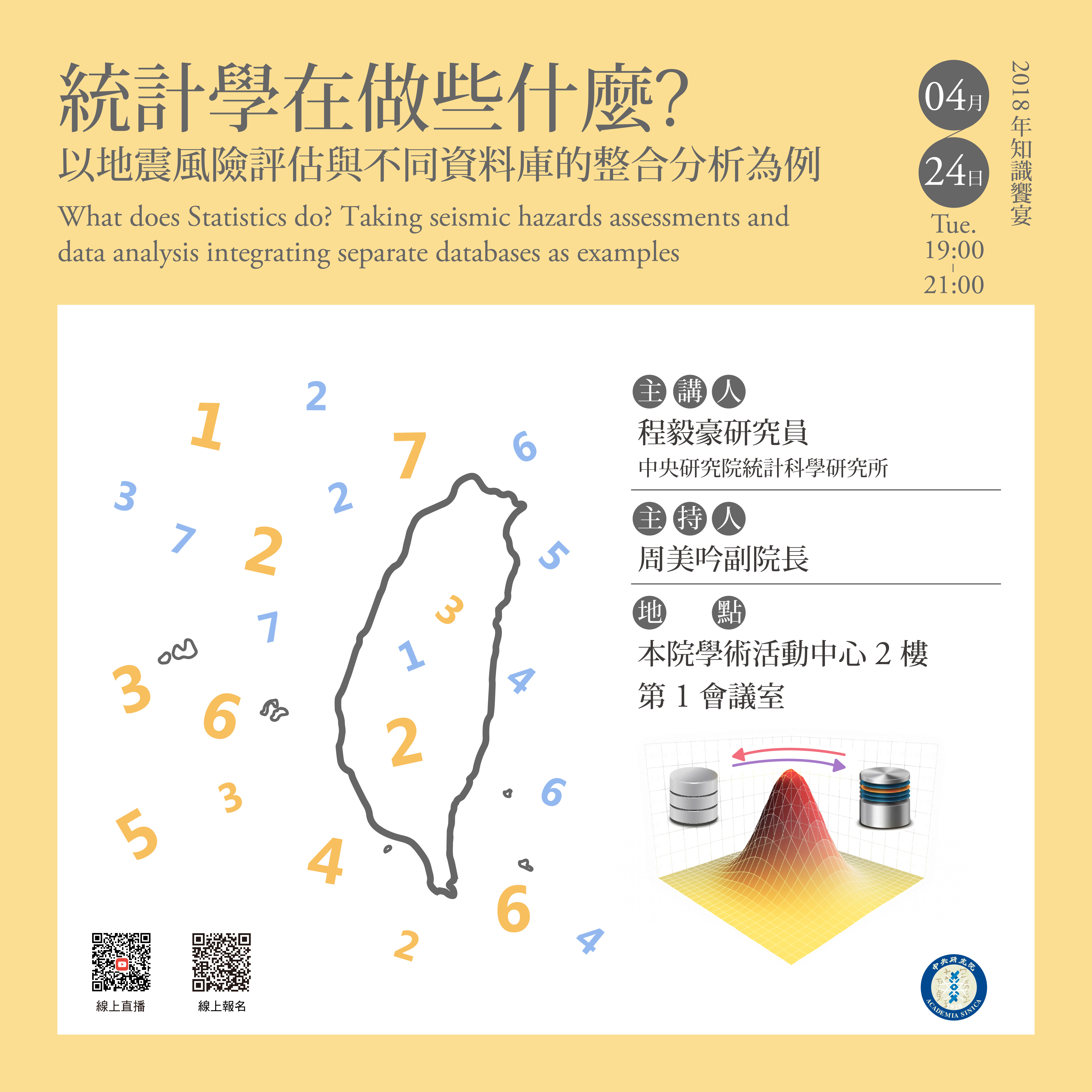 數據怎麼解決問題?中央研究院科普演講「知識饗宴」4月場邀請本院統計科學研究所程毅豪研究員擔任講者,和聽眾分享統計學的基礎知識,以及如何應用於生活中解決問題,或透過數據建立模型以評估地震風險。