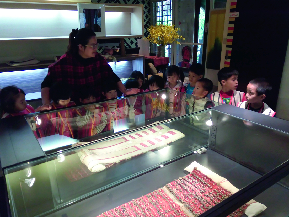 在為期兩個月的苗栗野桐工坊共作展示期間,尤瑪.達陸除了安排附近各小學前來進行校外教學和民族教學外(圖二),還舉辦兩場專業織品工作坊,讓有志於復振原住民織藝的文化工作者,得以藉由文物返鄉的機會,深入瞭解祖先的傳統技藝。工作坊成員之一的織藝工作者周麗萍說:「在部落看織品的感覺就是很不一樣」,「部落的環境很熟悉、很親切,我們可以自在地看」,而且「大家一起看,一起研究,彼此可以討論」。