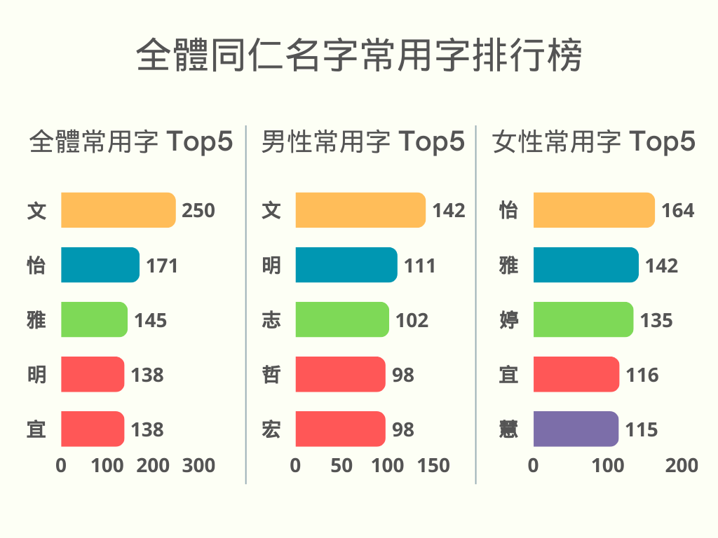 有些文字,特別常見於取名中。本院名字常用字,女性偏好如「怡」、「雅」、「婷」這類柔美字眼;男性則偏好「文」、「明」、「志」這些展現知性與學養的用字。其中「文」這個字更是全體同仁名字常用字冠軍,共有250位!或許反映出學術領域中,上一代在取名時對學習、知識與人文涵養等方面的期許與重視。