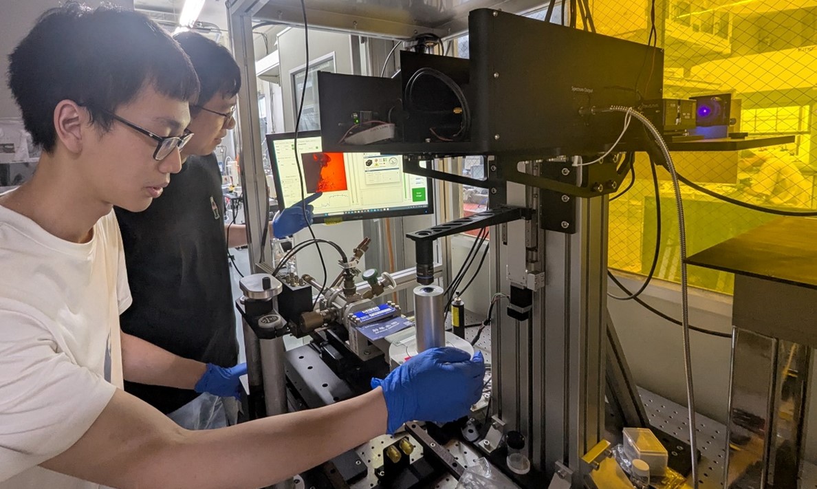 圖一:學生正在進行單層二維材料的轉印作業。這些超薄的原子層可以像貼紙一樣移轉並堆疊,是探索異質結構性質的關鍵步驟。