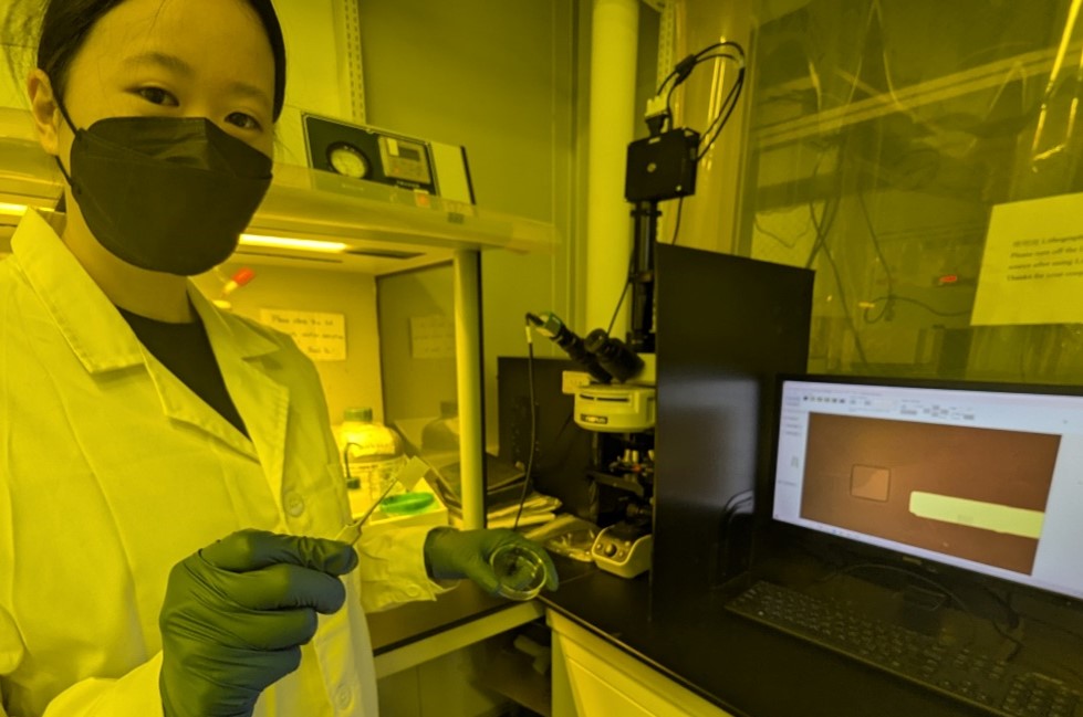 圖四:學生在我們實驗室一隅所搭設的黃光室內,利用簡便顯影流程進行樣品微影製程。這套系統讓我們能在材料上直接製作多種微尺度電極與結構元件。