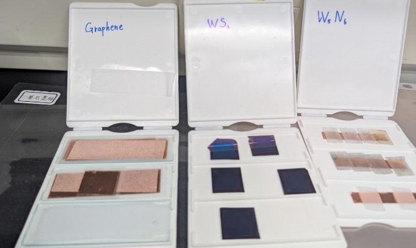 圖三:我們實驗室開發的多樣二維材料,由左至右為單層石墨烯、發光半導體TMDCs及單層二維氮化物W₅N₆。