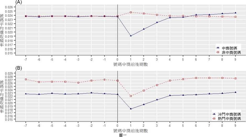 圖一(B)顯示兩個特性,第一,熱門中獎號組與冷門中獎號組,都受到賭徒謬誤的制約,被投注者選中的平均頻率,在中獎號碼公佈的次一期,都顯著下降。前者(紅色正方形點線)從0.0268降至0.0221,下跌17.54%(p < 0.0001),後者(實心三角形藍色折線)從0.0226降至0.0011,下降19.91%(p < 0.0001)。第二個特性,熱門中獎號組的平均被選中頻率,在不同的前後期,一致性的顯著高於冷門中獎號組的平均被選中頻率,而後者的頻率變化趨勢,與隨機選號頻率的走勢(圖一(A)的藍色折線),幾無二致。投注者偏好熱門中獎號碼的行為,表露無遺。
