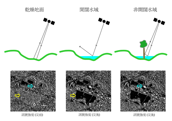利用合成孔徑雷達回波強度改變分析2016年美國北卡羅萊納州馬修颶風淹水實例(改自Lin et al., 2019)。當發生淹水事件的時候,如果淹水範圍連續且開闊(第一、二圖中的黃色箭頭),平滑的水面容易成為如同鏡子般的完全反射面,造成大部分的雷達波能量前向散射,而真正能夠回到衛星上被接收器記錄到的回波能量會低於同一地點在乾燥狀態下的能量。不過,如果淹水範圍內有許多的垂直構造物,如水中的植物、被淹水環繞的建築物等,容易造成雷達回波的「二次反射」,亦即在平滑水面上反射一次後,在垂直構造物上反射第二次,此種反射路徑會使大多數的能量返回衛星接收器,在影像上則會出現所謂的「亮點」(第一、三圖中的藍色箭頭),此亮點的回波強度甚至會高於乾燥狀態下的回波強度。因此透過判釋回波強度影像中的能量極低區與極高區,便可以偵測出淹水的範圍。
