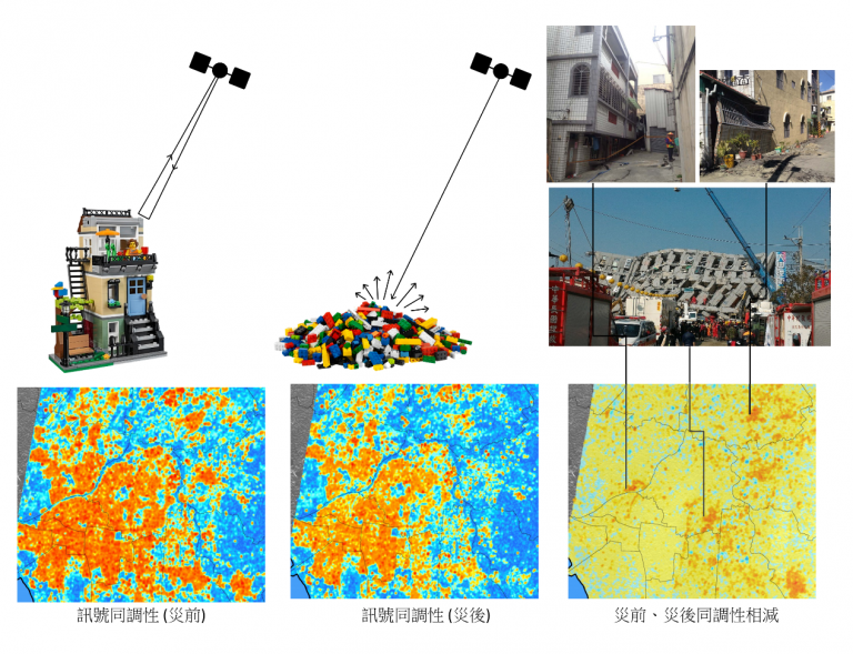 利用合成孔徑雷達同調性分析2016年美濃地震震後建築物受損之實例(改自Lu et al., 2018)。若房屋於地震中受損甚至全倒,其造成之雷達回波不僅傳播時間增加,其回波能量也會因為建築物的反射面改變而有所不同,而所謂的「同調性」改變指的便是傳播時間與反射能量此二者共同造成的變化。因此只要將災前與災後同調性影像相減,其中變化比較明顯的位置便可代表建築物受損之範圍。