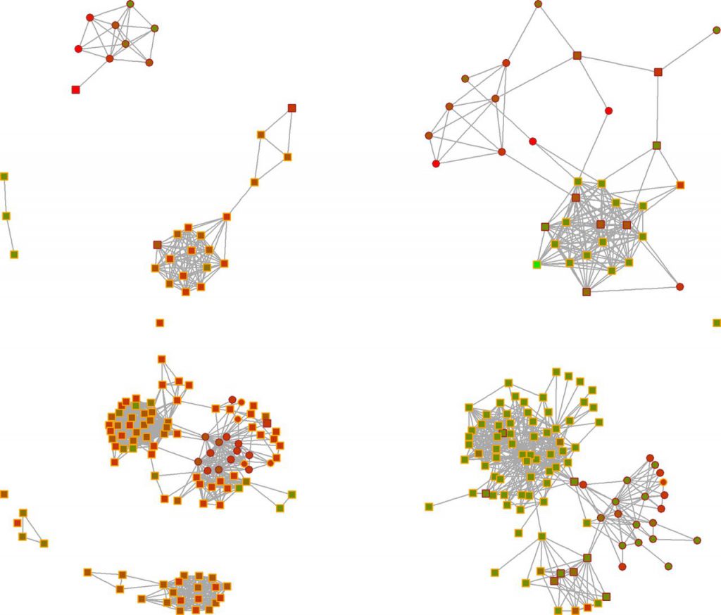 在點日記的研究設計中,除了如上述的方式,建構人際間的動態網絡外,另想回答一些經典且基礎的問題,例如心情與流感的感染,這兩個題目看似直覺,其實不易測量,傳統的心理學實驗可以在一個完全控制的實驗環境中,進行不同臉部表情或聲音語調上的操弄,再來看看情緒是否會相互傳遞;但在真實的人類環境中,每個人的心情會受到各種因素的影響,如何量測心情是否會到接觸對象的影響就非常的有挑戰性。依據美國2008年一篇使用一個長期追蹤世代的研究(Fowler et al, 2008; Framingham Heart Study),即便是每三到四年一次的追蹤研究都能發現人際間心情感染的現象,而且這種感染還可以傳到「朋友的朋友的朋友」身上(距離自己三個梯度的朋友),周圍的朋友中開心的朋友越多,自己將會越開心,這對於我們是很大的啟發,在這麼寬的追蹤過程都可以看到心情的傳遞影響,那「點日記」的受試者中是否也可以看到呢? 我們的研究成果中發現(Chan et al, 2018a),在距離自己一個梯度,也就是直接接觸的這類朋友,對心情的影響是最強且顯著的,若到朋友的朋友,則影響的效果會減半,但在結果中看不到對第三個梯度朋友的影響,除此之外,與朋友的孰悉程度、面對面的接觸方式、越長的接觸時間等,都是顯著影響心情是否在人際間傳播的關鍵因素,從圖1可以發現心情較好或較差的朋友有明顯的群聚現象。