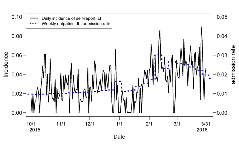 而流感的傳染,在許多的動物實驗中已經被證實,然而因為流感的傳染方式包含飛沫、空氣、接觸等傳播方式,在實際人際間的傳播方式就顯得複雜許多,而此處所提的流感,是指有類流感症狀的人,而非透過實驗室診斷確診流感的病人,透過點日記的受試者記錄自己與所接觸對象的類流感症狀,我們可觀察在人際間流感傳播的可能動態過程,在點日記的研究中 (Chan et al 2018b),於2015-2016的流感季中,共有160位受試者提供了14,317筆健康日記與124,222筆面對面的接觸日記,可以發現若受試者在過去三天有接觸到類流感病人,將會提升87%機率會發生類流感的相關症狀 (勝算比: 1.87;95%信賴區間: 1.40-2.50),個人熬夜、環境的氣溫變化大、空氣品質差也都會增加罹患類流感症狀的風險,但還是有一些健康行為可以協助降低風險的,例如較長時間的運動、多吃水果、豆類與奶製品皆顯著的降低罹患類流感的風險,此類資料也可以用來偵測社區中的類流感流行,圖2中使用點日記這160名受試者的通報資料與疾病管制署的門診就醫率資料相比,發現整體的趨勢相當一致,也是潛在疾病監測上利用鄉民資料進行監測的一個實例。