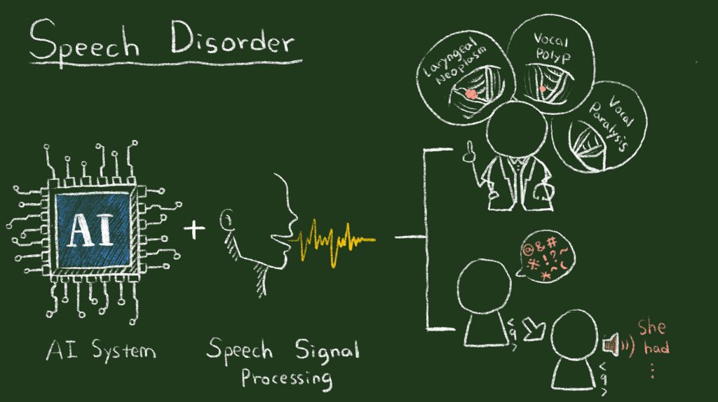 人類語音訊號是肺部送出的氣流,流經氣管、聲門,在口腔或鼻腔的中形成共振。發音過程中,需要唇、舌、齒等器官適時地阻斷氣流,產生不同語音。當這條路徑的任何一部份出現異常,皆會造成語音品質以及理解度下降。近年來,有越來越多針對發生異常的診斷以及改善語音的理解度的研究。針對構音異常診斷,通常是請說話者發出一個長母音或是產生一個句子,經由分析聲音的特性判斷語音正常與否。若為構音異常,則再進一步分析異常的類別。數項研究指出基於深度學習的判斷器能夠較傳統機器學習判斷器提供更佳的診斷效能。此外,由於職業、性別、年齡、生活習慣(是否有菸、酒習慣)對於發聲也會有影響,因此最近筆者團隊開發出一套新穎的多模態聲音診斷系統。此診斷系統是基於深度學習模型優異的融合功能,結合聲音以及病史兩種截然不同的資料型態。實驗結果證實此系統可以提供比單獨聲音為主的判斷系統提供更準確的診斷。除了發聲診斷系統,筆者團隊亦投入開發新穎的構音輔具技術,目標是提升構音異常人士的語音理解度,增進其與其他人的溝通效率。我們嘗試使用新穎的深度學習模型(包括非負矩陣分解以及對抗式生成模型)對構音異常語音增強,實驗證明能夠有效地提升口腔癌術後的語音理解度。未來我們將會繼續嘗試結合自動語音辨識、更新穎的語音訊號處理技術在構音異常輔助優化的任務上。