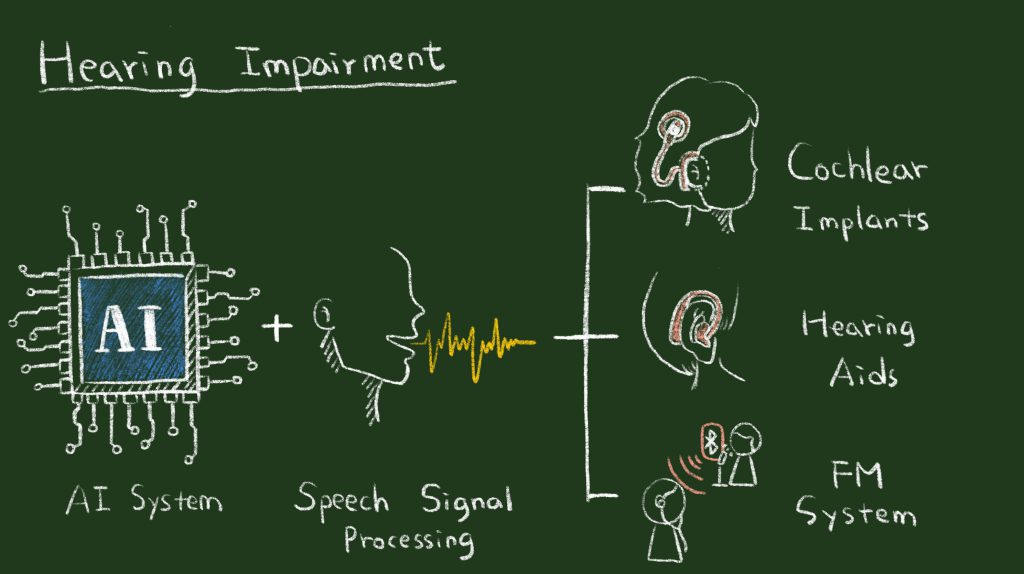由於人類壽命增長、環境噪音頻繁出現、過度使用耳機,近年來聽損人數逐年升高,而聽損族群的年齡卻逐年下降。根據最新的國際報導指出,超過70歲以上的長者,2/3的人有不同程度的聽損,由於不易發覺,聽損初期通常會被忽略。就算是確定有聽損,由於聽覺輔具所費不貲,年長者常常會因為不願意花晚輩的錢而打消購買念頭。目前國際上有許多學者正在提倡降低聽覺輔具的價格,以提升聽障者購買及配戴聽覺輔具的意願。除了價格之外,聽覺輔具還有另一個重要的問題:噪音情境使用下效果不佳的問題。根據國際研究指出,有95%使用者指出當在有噪音情境下使用聽覺輔具時通常無法得到理想的聲音品質以及語音理解度。由於環境噪音(特別是與人類語音特性相近的噪音)通常難以準確估測;因此,要能夠有效消除雜訊是語音訊號處理相當棘手也是多年懸而未決的問題。好消息是,近年來人工智慧(特別是深度學習理論)的進步對解決這個問題帶來了曙光。