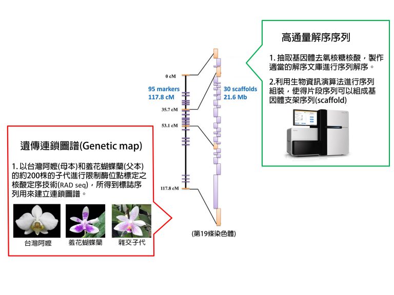 我們實驗室與臺灣大學陳凱儀及成功大學張松彬組成研究團隊,共同完成了臺灣阿嬤基因體解序與序列組裝。除此之外,我們以粗絲期染色體螢光原位雜合技術建立第一個蝴蝶蘭染色體圖譜,並且使用限制酶位點標定之核酸定序技術(RAD seq)取得大量遺傳標記,完成蘭科植物第一個遺傳連鎖圖譜(genetic map)。臺灣阿嬤的基因體約為1.25 Gb(億鹼基),雖然在蝴蝶蘭屬裡面算是比較小的基因體,但這可是模式植物阿拉伯芥基因體的十倍大,也是水稻基因體的三倍大。如此複雜的基因體,使用高通量定序資料做電腦序列組裝往往僅能得到數萬個基因體支架序列(genomic scaffold),而且植物基因體裡常有高度重複的區域也容易造成組裝上的錯誤。單由序列組裝的結果無法判斷基因體支架序列屬於哪一條染色體,更遑論其在染色體上的位置。若想要知道基因體支架序列在染色體上的位置與順序,還需要有遺傳連鎖圖譜的幫忙。