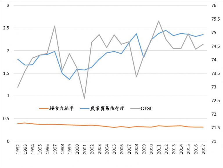 我們也曾利用GFSI的概念,描繪出台灣過去20年糧食安全與糧食自給率、農業貿易自由化之關係,如圖二所示(Chen et al., 2016)。當中糧食自給率來自於行政院農委會歷年發佈之「糧食供需年報」,農業的對外貿易依存度可反映出我對外開放之程度變化,係由本研究自行根據農委會的農業貿易資料庫計算而得。台灣歷年的GFSI則是我們假設經濟學人提供的專家權重以及各個副指標的標準化上下界均固定不變之狀況下,自行使用台灣資料所計算而得。