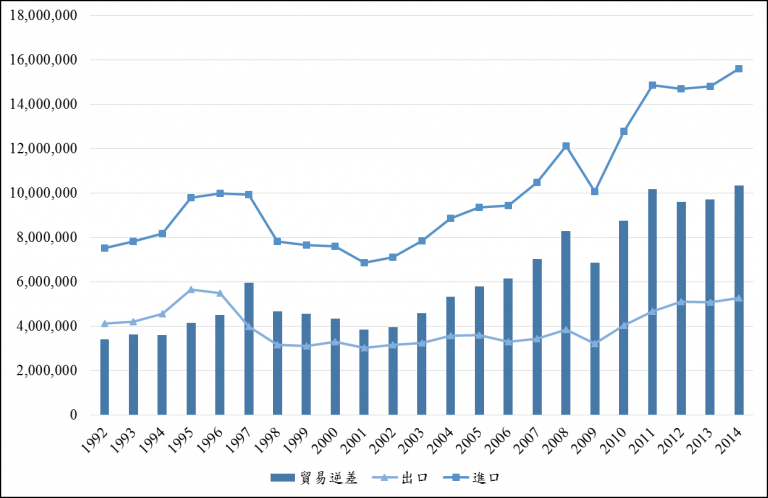 台灣在2002年加入WTO後,為兌現入會承諾,農工產品的進口關稅大幅下降。以農產品為例,圖一為根據行政院農委會農業貿易資料庫整理台灣1992年至2014年之台灣農產品貿易概況。除1997年至2000年因亞洲金融風暴緣故,導致農產品進口值下跌之外,自2002年起,農產品進口開始大幅上升,幅度明顯超過入會前。出口的部分變動不大,導致農產品貿易逆差逐年擴大,但從2011年開始,此逆差成長也逐漸趨緩。