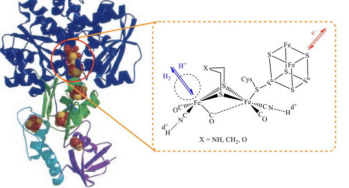 氫化酵素在進行氫氣/質子代謝上有極佳的效果,在溫和的條件下,其質子還原催化速率為每秒產生6000-9000個氫分子。在分解氫氣上,催化速率可達每秒28000氫分子。[1] 氫化酵素根據其活性中心結構來區分,可分為三類。針對化學能轉換儲存的議題來說,最佳的氫化酵素具有雙鐵活化中心。從Clostridium pasteurianum (CpI)以及Desulfovibrio desulfuricans (DdH)所分離出的活性中心,其雙鐵核心透過半胱胺酸中的硫醇官能基橋接一個四鐵四硫團簇(圖一)。在此雙鐵核心中,有一組雙硫基橋接在這兩個鐵中心上。此外,每一個鐵中心也鍵結一個一氧化碳(CO)和氰酸根(CN-)的配位基。在其中一個鐵中心,另有一個半橋接狀態的CO配位基及一個配位空位,其主要功能是允許基質配位於鐵中心進行催化反應。四鐵四硫團簇負責電子進出雙鐵中心,用以調控雙鐵核心的電子結構,以利氫氣的產生及代謝。