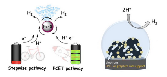 和大多數由酵素協助的催化反應一樣,調控質子和電子轉移是這類催化最重要的關鍵,例如,在Tyrosinase催化鄰苯二酚(benzene-1,2-diol)為1,2-苯醌(1,2-benzoquinone)的過程中,Tyrosinase中的酪氨酸官能基協助前者脫去兩個質子及兩個電子。[7] 一般而言,當質子化先發生在催化中心上,其還原電位就被大幅降低,或當催化中心先行接受電子,還原態的催化中心對質子的親和力就被加強;[8] 然而,欲使質子化或還原反應先發生,主要牽涉到催化核心中σ電子對強度、路易士酸鹼度,以及最低未填滿分子軌域(lowest unoccupied molecular orbital, LUMO)的能階。因此質子化和還原態反應似乎具有相互影響的因果關係,但不盡然。在某些特殊的條件下,質子和電子轉移可同時發生。[9] 在這類質子-電子偶合反應中,質子化及還原態的中間物沒有生成,反應直接略過此兩種高能階步驟,達到最終產物。在最近的研究中,我們找到一系統可進行此類反應。[10] 藉由質子-電子偶合反應,我們證明催化反應所需的能耗以及過電位大幅降低,取而代之,反應速度和催化效率顯著增加(圖二左)。也就是說,質子-電子偶合反應同時提供熱力學及動力學上的益處。