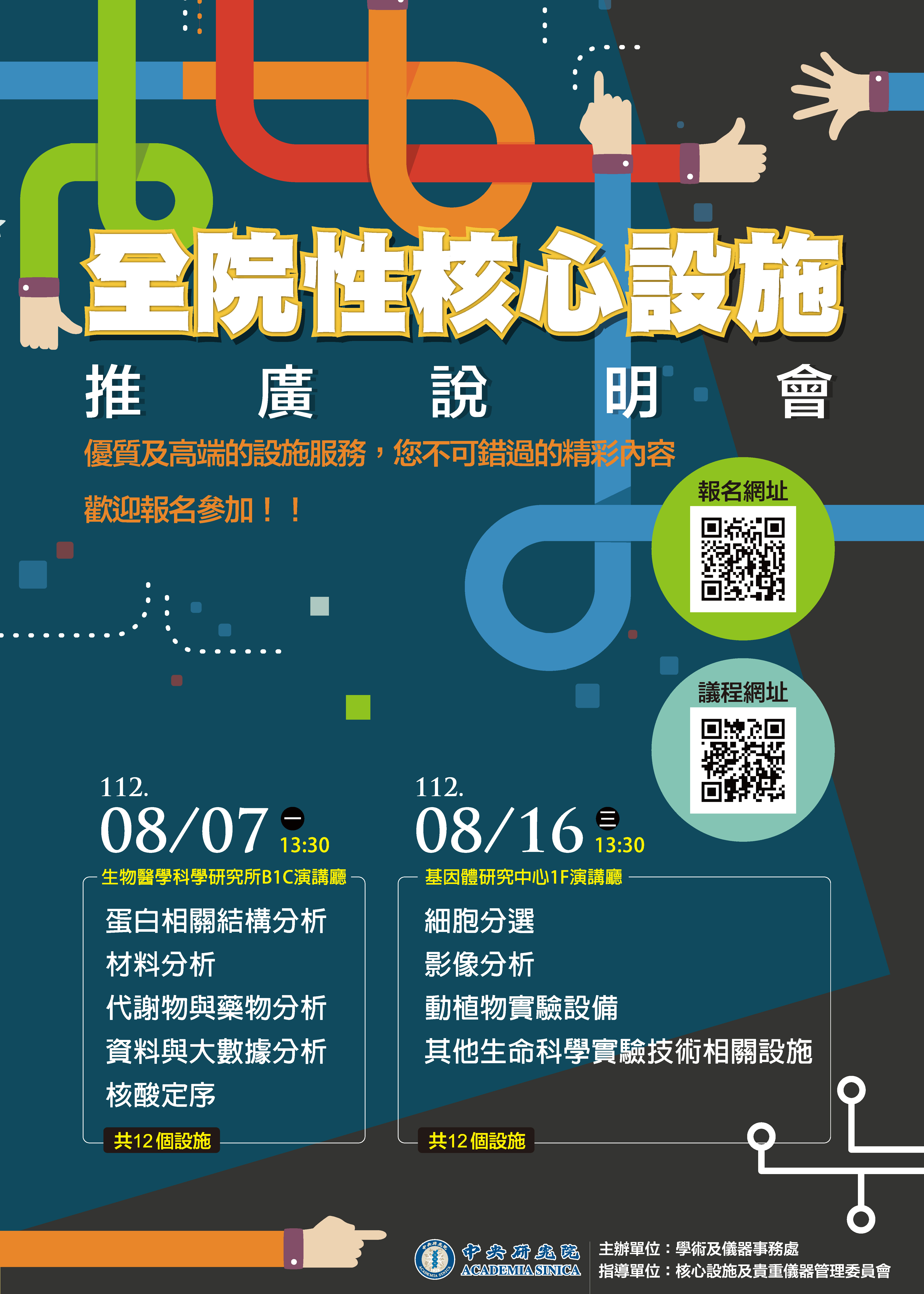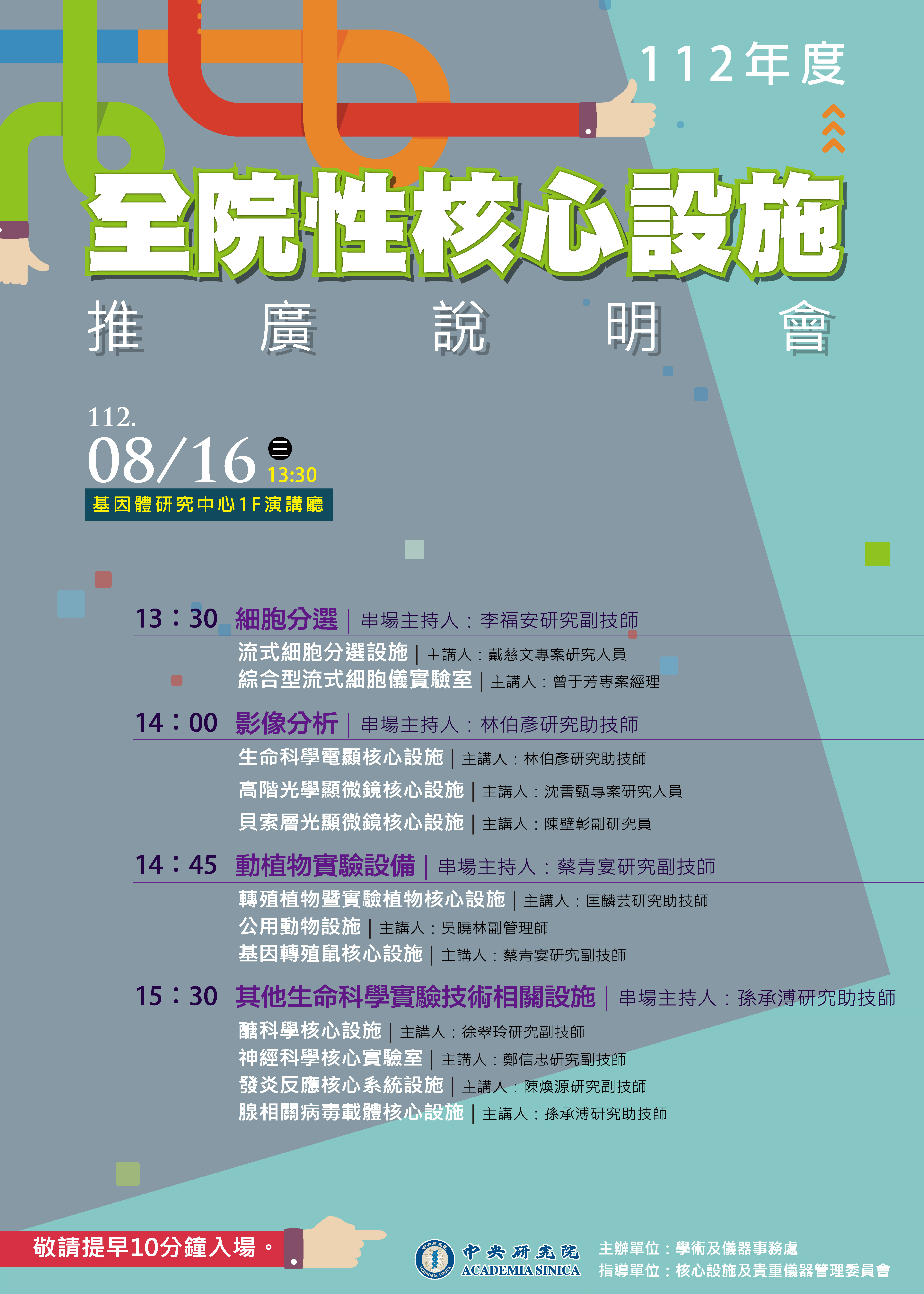 為推廣全院核心設施並提供優質研究服務,本處辦理112年度「核心設施推廣說明會」,邀請設施針對所提供之服務向同仁們說明,歡迎院內同仁及院外各界人士踴躍參加。