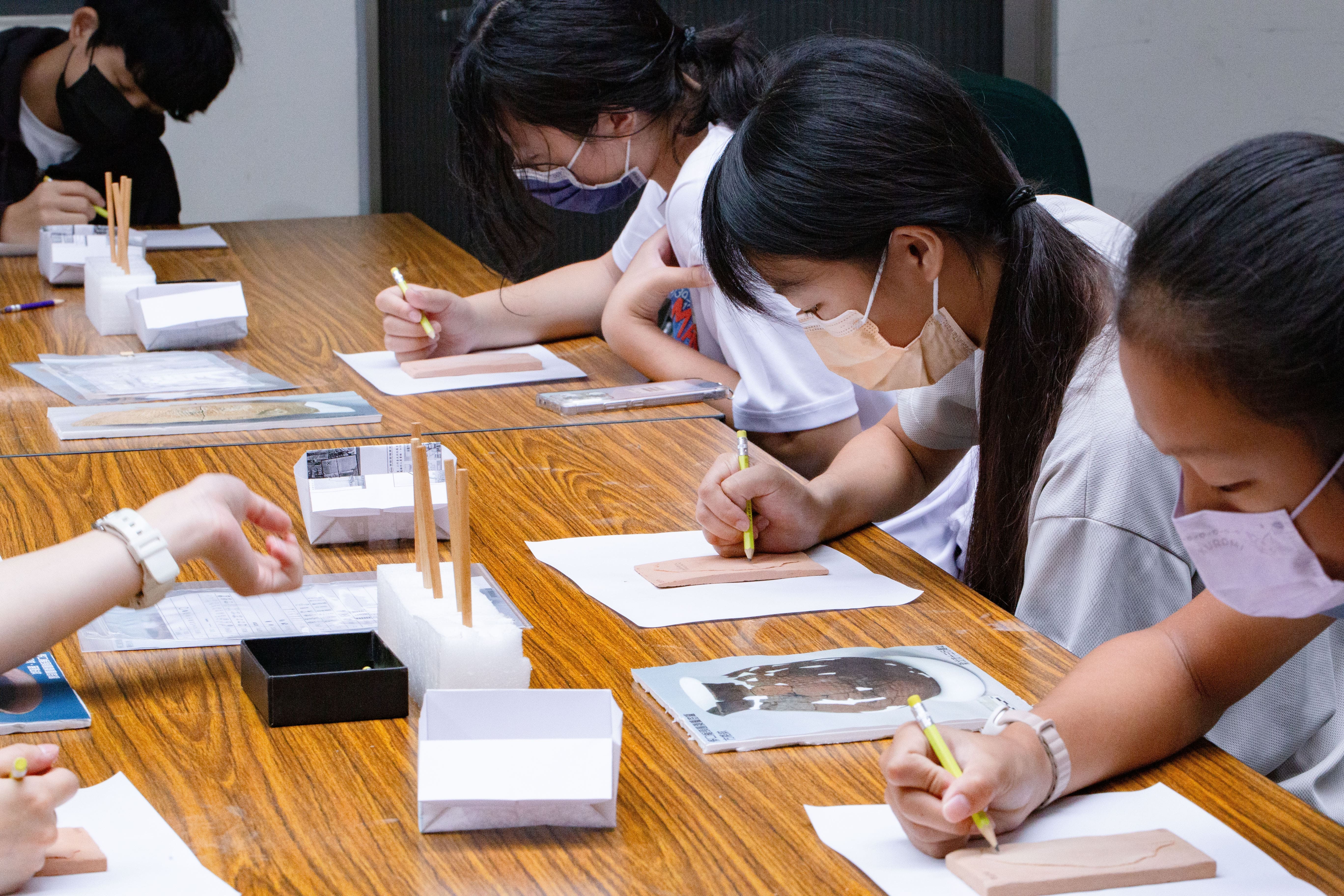 史語所「陶板紋飾雕刻拓印」活動,讓參與者在臺灣圖像的陶板上,創造出屬於自己的獨特圖樣。(圖片來源:中央研究院)